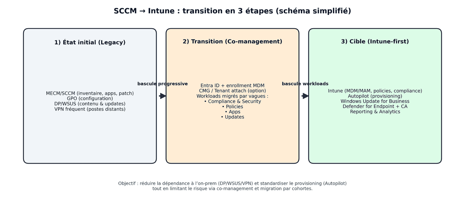 - Maintien SCCM pour les cas spécifiques (legacy, apps très lourdes, sites contraints)